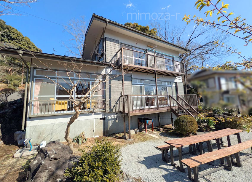 『伊豆高原』駅 海・大島一望の眺めのいい平家テーブルセットも置ける広いデッキ